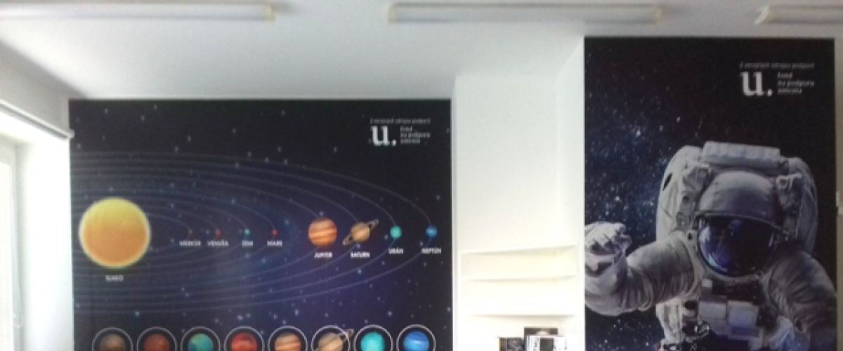 Zatiaľ sme pokryli dve biele steny fototapetami slnečnej sústavy a kozmonautom, ktorý bude kývnutím ruky vítať všetkých nadšencov astronómie. Veríme, že toto privítanie vás všetkých poteší.