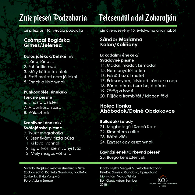 Pri príležitosti 10. výročia podujatia Znie pieseň Podzoboria KOS v Nitre v roku 2018 vydalo CD nahrávku s ľudovými piesňami z obcí na Podzoborí