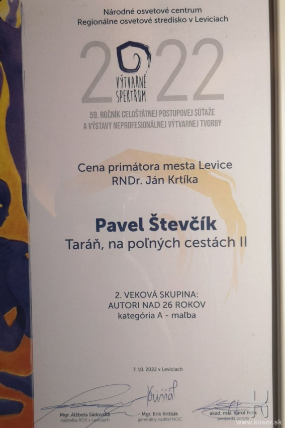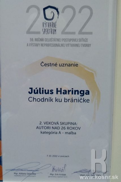 Za Krajské osvetové stredisko v Nitre získali 2x ocenenie Pavel Števčík a čestné uznanie Július Haringa. „Moje prvé pocity po zverejnení výsledkov boli veľké prekvapenie. Pri preberaní ocenenia som cítil veľkú zodpovednosť, vďaku a zadosťučinenie za posledné 3 roky práce.“ povedal Pavel Števčík. A ako to prežíval Július Haringa? „Po informácii, že sme spolu s Pavlom Števčíkom prešli sitom celoslovenskej poroty a boli sme ako jediní z Nitry ocenení, v prvom okamihu to brnklo na moju ješitnosť, našťastie, iba na pár sekúnd... Spomenul som si na Evku Hudecovú, ktorá ma svojím nadšeným rozprávaním o akvareli naviedla toto médium vyskúšať. Som jej stále za to vďačný. Len to potvrdzuje ako dôležití sú ľudia, ktorí nás obklopujú a chtiac alebo nechtiac významne ovplyvňujú. Uvedomil som si, aké sú dôležité jednotlivé slová alebo vety od tých, ktorí nás učia a ich podpora. To je fantázia, akú silu má slovo. Václav Cílek definuje nudu ako neprítomnosť vzruchov, pocitov a naplnenia. Celý slávnostný večer, ako povedala moderátorka, večer víťazov, prehliadka výstavy, konzultácia s doc. Mgr. Migašovou o mojich vystavených obrazoch, ale aj o aktuálne dvoch nových ukázaných v mobile, mi dali taký zvláštny pocit sily a naplnenia. Som spokojný, rezonuje vo mne pocit pokory.“