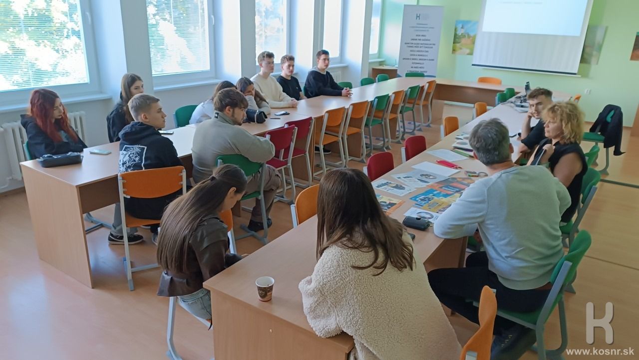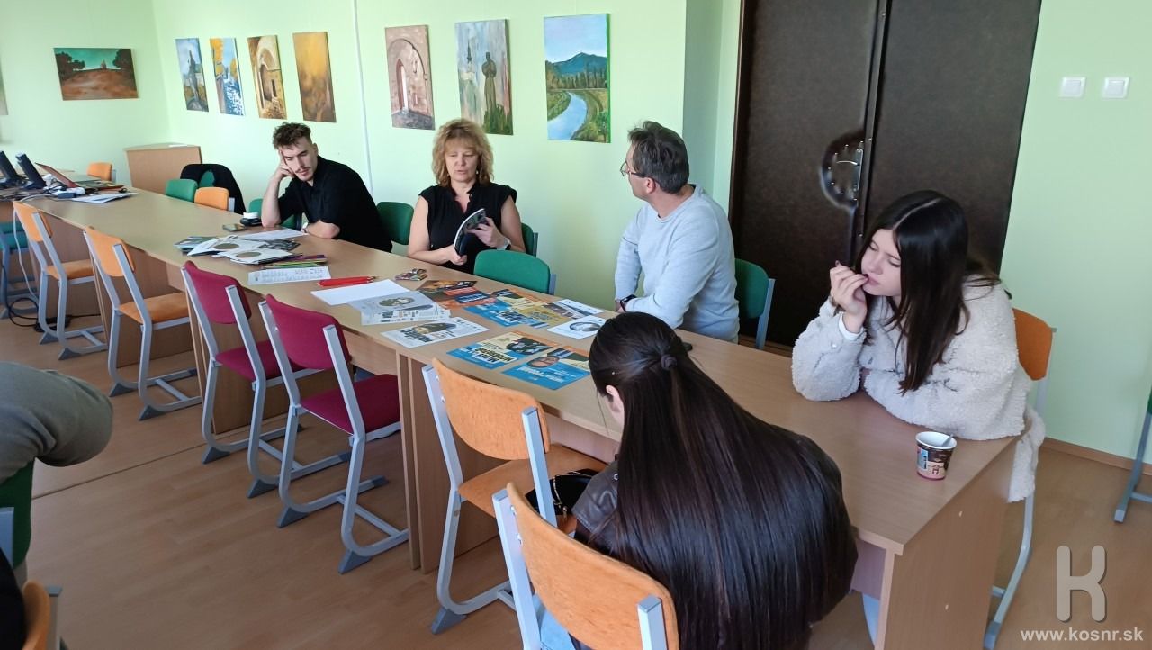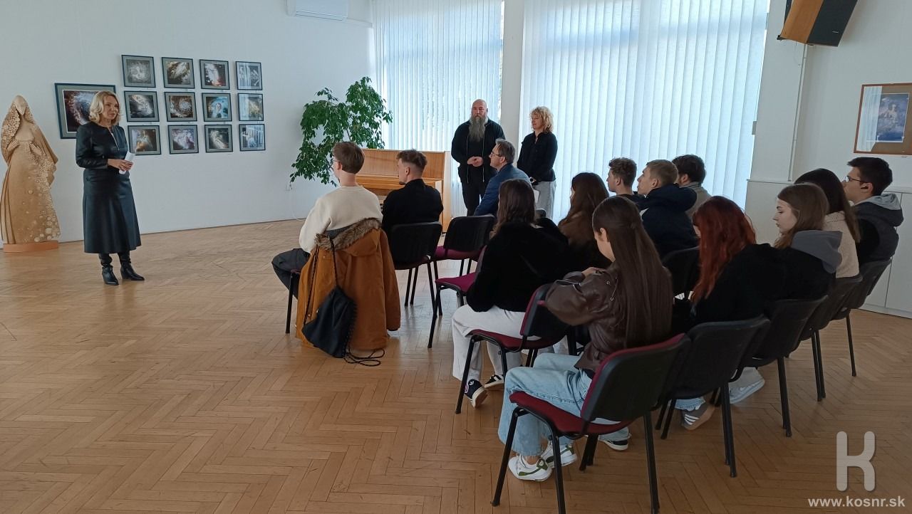 Srdečne ich privítala pani riaditeľka Eva Antošová spoločne s jej spolupracovníkmi. Dozvedeli a na vlastné oči sa presvedčili, že sa tu konajú výborné výstavy, súťaže, tvorivé dielne a kultúrne podujatia pre deti, mládež aj dospelých. Pani riaditeľka študentom porozprávala mnohé dôležité informácie o umeleckých dielach, ktoré tam boli aktuálne vystavené alebo ktoré sa v minulosti v Krajskom osvetovom stredisku vystavovali. Medzi tým, ako sa študenti presunuli do miestnosti, ktorá sa volá zelená zasadačka, im pani riaditeľka ukázala átrium plné kvetín a nádhernej vône, ktoré sa dá najmä v teplejšie dni využiť na oddych, alebo na konanie rôznych kultúrnych podujatí.
