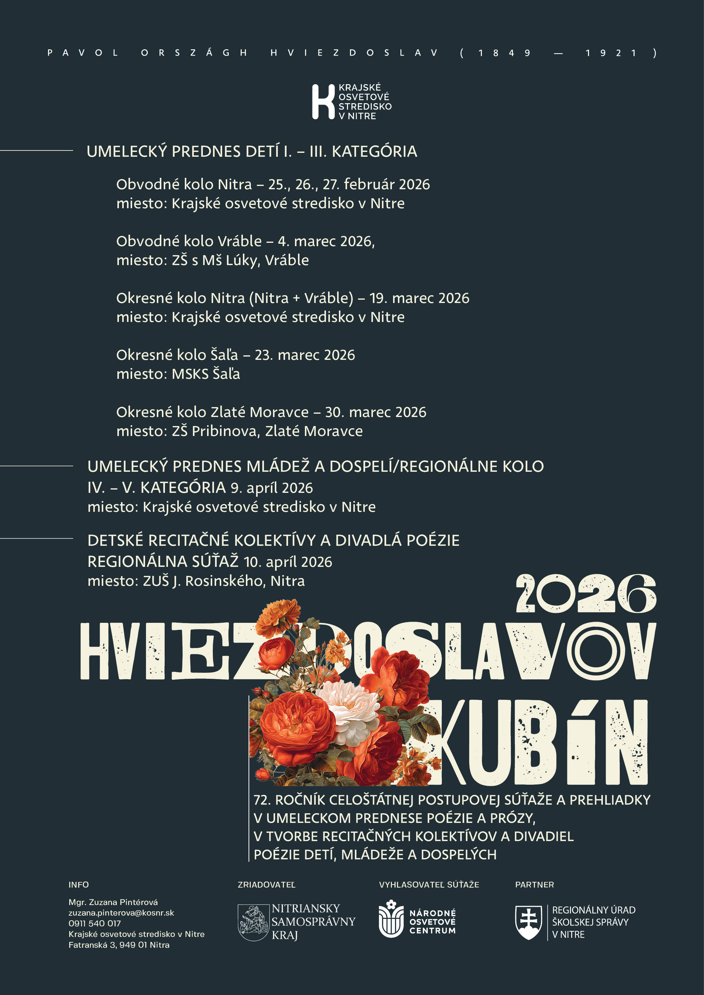 Krajské osvetové stredisko v Nitre v spolupráci s Regionálnym úradom školskej správy pripravujú obvodné, okresné a regionálne kolá 72. celoštátnej postupovej súťaže a prehliadky v umeleckom prednese poézie a prózy, v tvorbe recitačných kolektívov a divadiel poézie detí, mládeže a dospelých, Hviezdoslavov Kubín 2026. Vyhlasovateľom a odborným garantom je Národné osvetové centrum z poverenia Ministerstva kultúry SR a Ministerstva školstva, vedy, výskumu a športu.