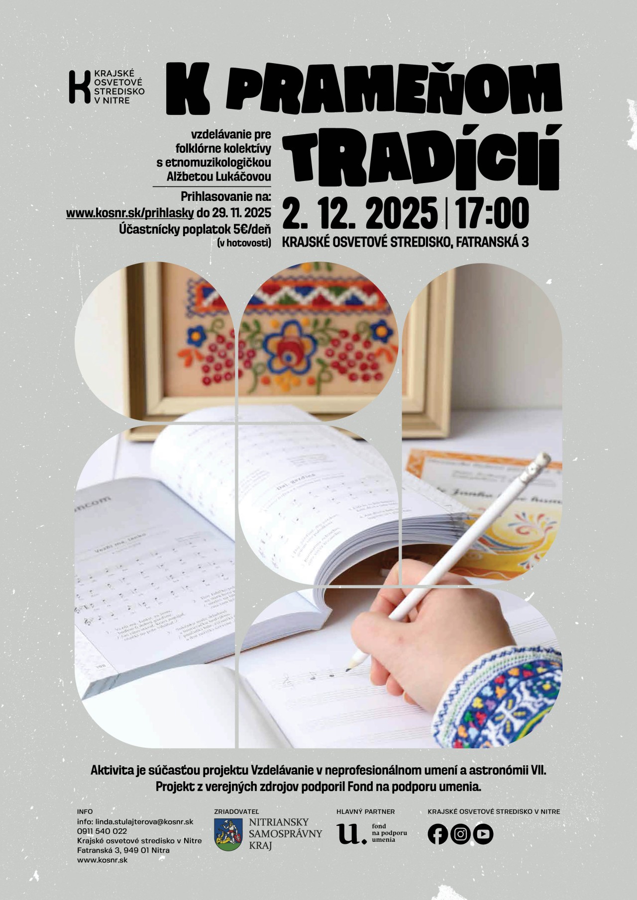 Počas teoreticko-praktického seminára k spevnej tradícii 2.12.2025, sa účastníci pod vedením lektorky etnomuzikologičky Alžbety Lukáčovej dozvedeli o fungovaní ľudovej piesni v tradičnom prostredí, spevnej tradícií, analýze vybraného piesňového materiálu, hlasovej príprave, tvorbe tónu a rôznych ozdobných spevných technikách. Lektorka ukázala účastníkom cestu ako nazerať a pracovať s pramenným materiálom, na čo si dávať pozor pri analýze spevného materiálu. Seminár mal aj praktickú časť, zameranú na interpretáciu vybraného repertoáru z Jedľových Kostolian, na základe transkripcie a analýzy, ktorú zrealizovala lektorka. Lektorka priblížila aj archívny materiál, ktorý je ťažší na interpretáciu. Účastníci si ho vypočuli a mali možnosť ho vďaka lektorkinej analýze pochopiť. Celkovým prínosom projektu pre folklórne hnutie je odbornejšia a efektívnejšia práca vedúcich a členov vo folklórnych kolektívoch, skupín, ako aj členov folklórneho hnutia, ktorú budú môcť rozvíjať a následne aplikovať vo svojich kolektívoch a umeleckej tvorbe následne reprezentovať Nitriansky kraj na rôznych podujatiach a postupových súťažiach, festivaloch.