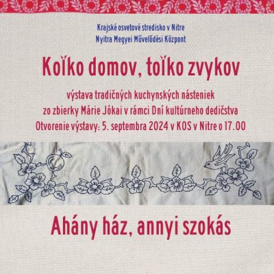 Srdečne vás pozývame na jedinečnú výstavu tradičných kuchynských násteniek zo zbierky Márie Jókai, ktorá je sprístupnená v Krajskom osvetovom stredisku v Nitre. Táto výstava vám ponúka jedinečný pohľad do histórie kuchynských dekorácií a priblíži vám umelecké stvárnenie každodenných predmetov, ktoré boli kedysi neoddeliteľnou súčasťou domácností. Nástenky, ktoré môžete vidieť, sú starostlivo vybrané z rozsiahlej zbierky, a každá z nich rozpráva svoj vlastný príbeh o ľudových tradíciách, remeselnej zručnosti a kultúrnom dedičstve minulých generácií.