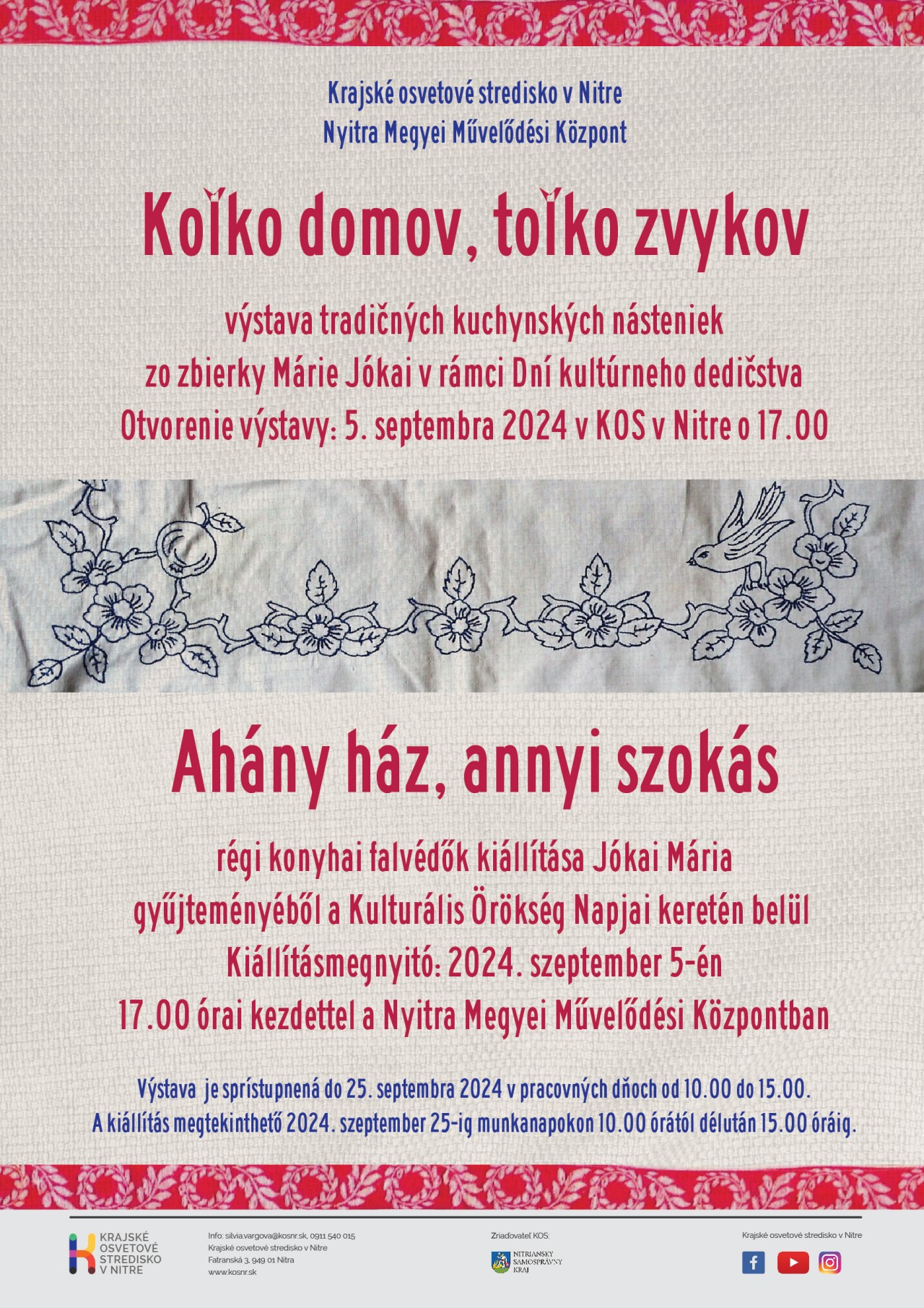 Výstava bude otvorená do 25. septembra 2024 v pracovných dňoch od 10.00 do 15.00 hod. v priestoroch veľkej výstavnej sály Krajského osvetového strediska v Nitre. Nechajte sa inšpirovať bohatosťou motívov, farieb a vzorov, ktoré reflektujú rozmanitosť kultúrneho dedičstva našich predkov.