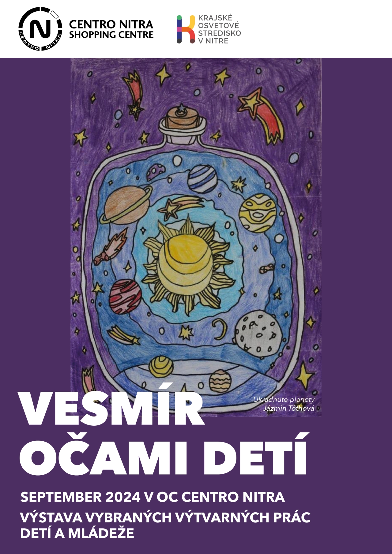 Krajské osvetové stredisko v Nitre v spolupráci s obchodným centrom OC CENTRO vás srdečne pozýva na výstavu jedinečných výtvarných prác detí a mládeže z tohtoročnej súťaže "Vesmír očami detí". Výstava predstavuje najlepšie diela mladých umelcov, ktorí svojimi kresbami a maľbami vyjadrili svoju predstavivosť, kreativitu a fascináciu vesmírom. Prostredníctvom farebných obrazov, originálnych kompozícií a nápaditých techník sa môžete ponoriť do magického sveta planét, hviezd, rakiet a mimozemských bytostí, ako ich vidia naši najmladší tvorcovia.