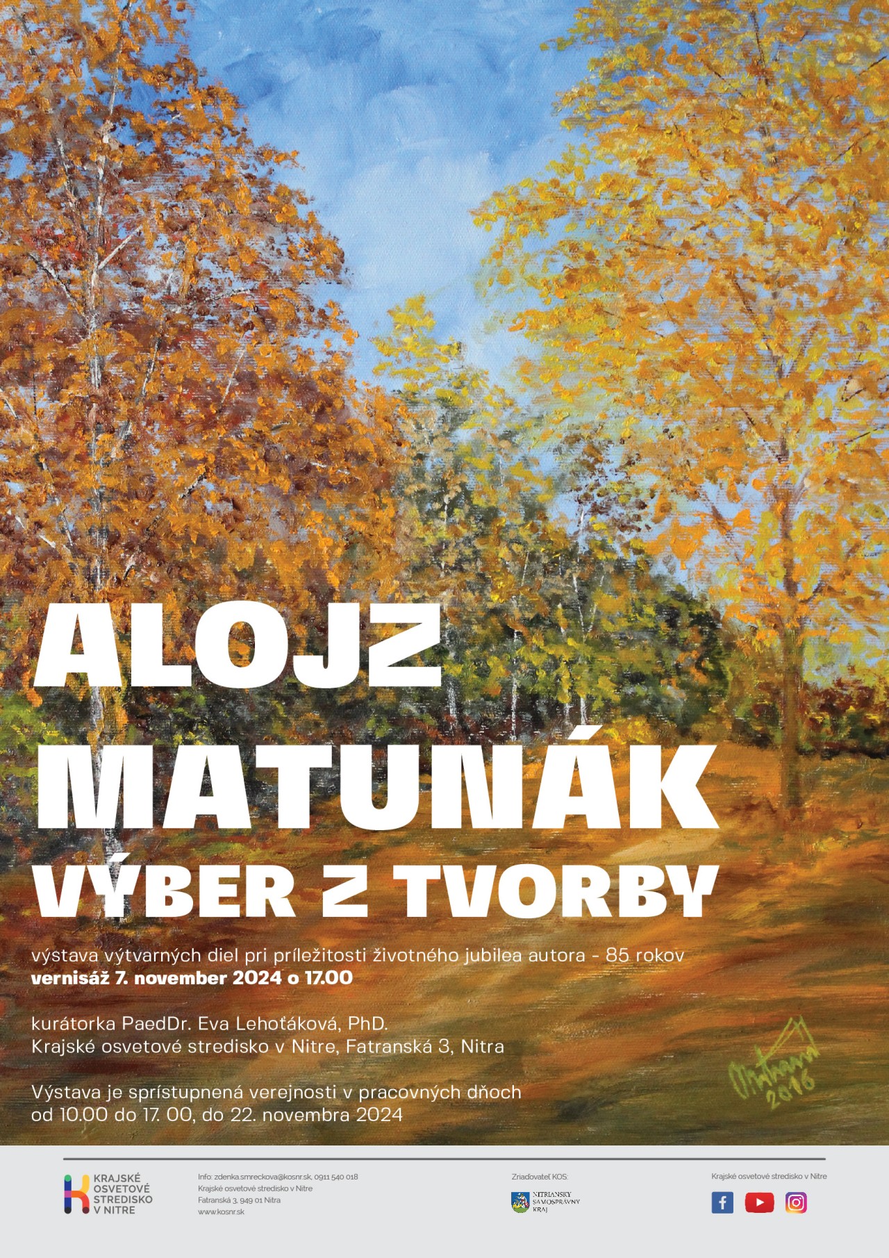 Výstava výtvarných diel Alojza Matunáka, neprofesionálneho výtvarníka pri príležitosti jeho krásneho životného jubilea – 85 rokov.