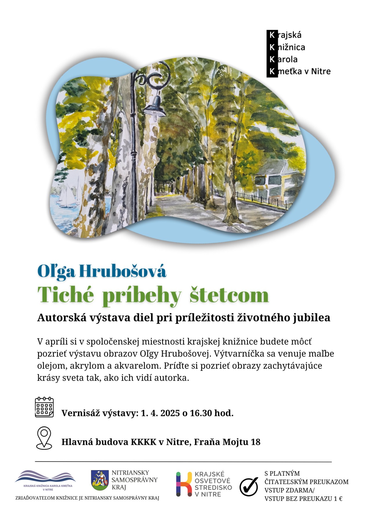 V mene Krajského osvetového strediska v Nitre a Krajskej knižnice Karola Kmeťka v Nitre vás pozývame na výstavu krajinomaľby a kvetinových zátiší Oľgy Hrubošovej. Autorku na vernisáži predstavila Zdenka Smrečková, z KOS v Nitre, ako neprofesionálnu výtvarníčku, ktorá sa neustále výtvarne vzdeláva, navštevuje workshopy, plenéry a sympózia organizované KOS v Nitre, Súkromnou ZUŠ v Nitre Ateliérom Médea, Nitrianskou galériou, absolvuje Univerzitu III. veku UKF v Nitre. Vystavovala v rámci kolektívnych výstav v Leviciach, medzinárodných výstav v Maďarsku, na Morave, na Slovensku v Banskej Štiavnici, v Nitre. Spolu s Júliou Winklerovou a Františkom Hečkom mala v 2018 v KOS v Nitre výstavu pod názvom Tri pohľady na prírodu a v 2019 vystavovala pod názvom Farebná paleta vo Fakultnej nemocnici v Nitre.