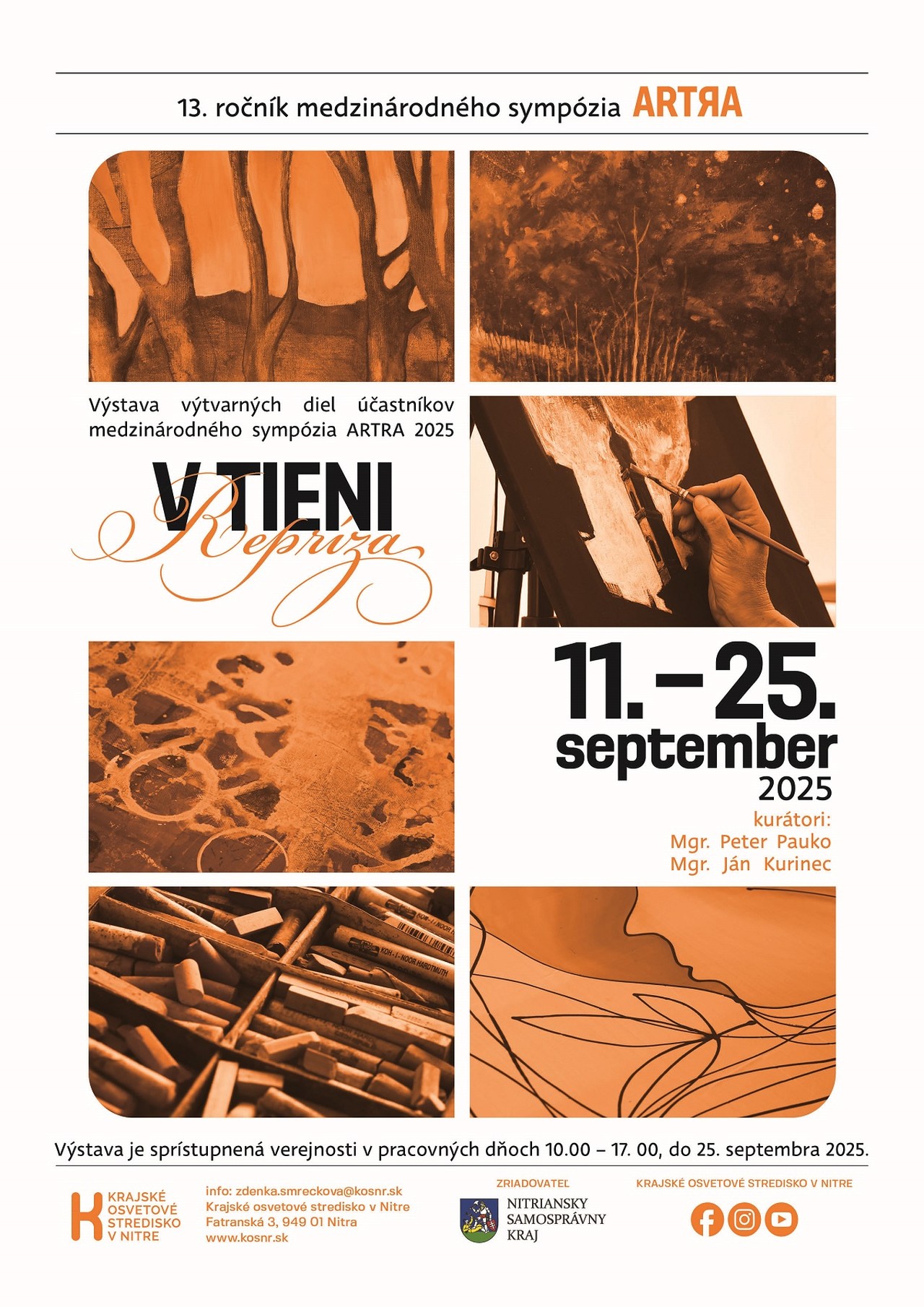Srdečne pozývame od 11. septembra 2025 všetkých prívržencov výtvarného umenia do Krajského osvetového strediska v Nitre na výstavu prác medzinárodného sympózia, ktoré sa konalo v júli v Poľovníckom kaštieli v Palárikove. Sú to artefakty účastníkov z rôznych kútov Slovenska i zo zahraničia, ktoré vznikli pod odborným vedením lektorov - Mgr. Ján Kurinec a Mgr. Peter Pauko. Príďte sa prostredníctvom prezentácie nadýchať atmosféry z individuálnej tvorby, ale i z workshopov a objaviť nové pohľady na umenie, zažiť jedinečné spojenie histórie, prírody a tvorivosti. Kolekciu si môžete pozrieť v Krajskom osvetovom stredisku v Nitre, do 25. septembra 2025, v pracovných dňoch od 10. 00 do 17. 00.